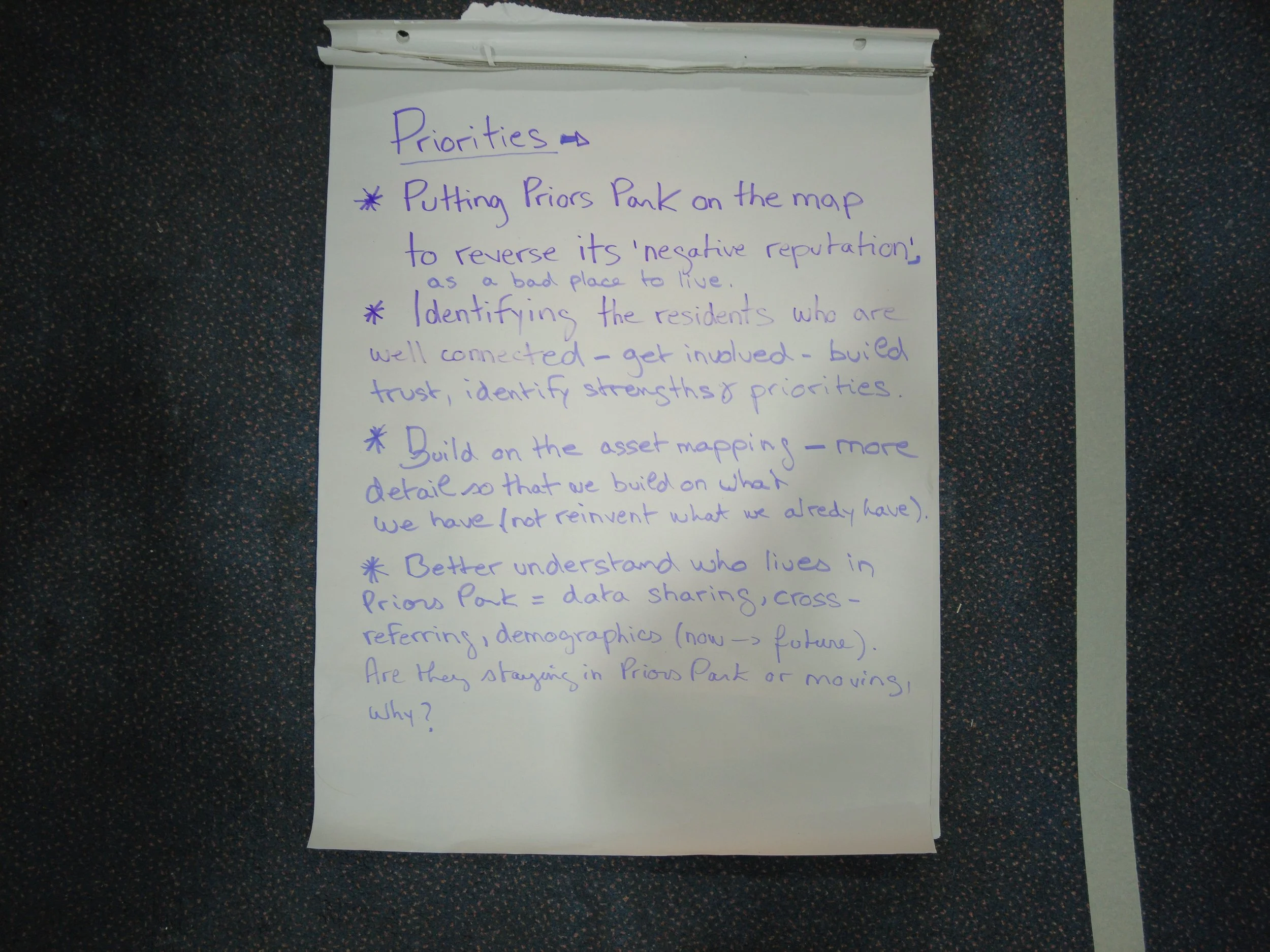 The group was split in half, each one tasked to define what the purpose of the place plan should be, starting with the prompt “In Priors Park we want to…”. The only real parameters were that it had to be in clear, plain language, that it had to be community friendly and it had to be specific and not vague.